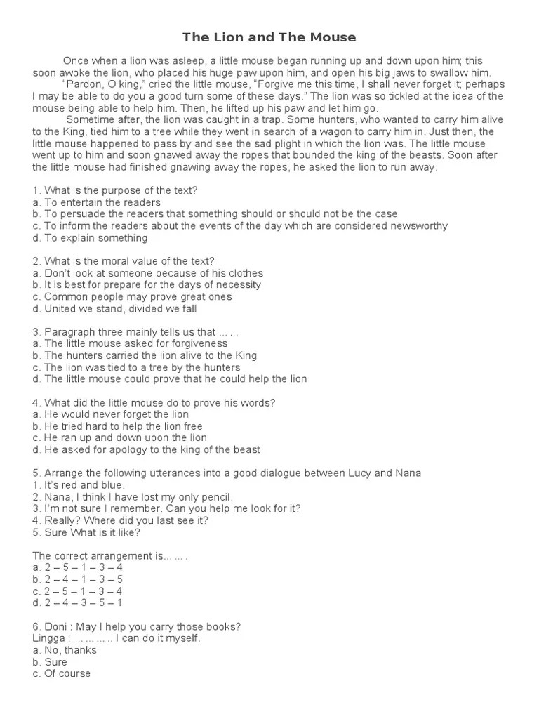 Soal Bahasa Inggris The Lion And The Mouse - 1 What Happened To The Mouse 2 What Happened To The Lion Few Days After He Met The Mouse 3 Why Brainly Co Id / Sometime after, the lion was caught in a trap.. the lion was so tickled at the idea of the mouse being able to help him. Where the problems in the story developed. soal try out bahasa inggris sma (try out) choose the best answer. Once when a lion was a sleep, a little mouse began running up and down upon him; What did the mouse do to thank to the lion?