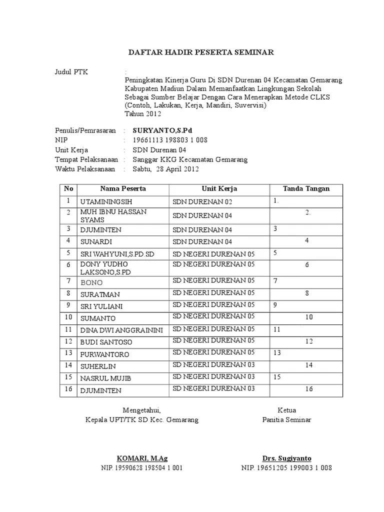 Contoh Daftar Hadir Peserta Seminar Ptk : Seminar Hasil Penelitian Tindakan Tahun 2018 Gugus Iv Diponegoro Info Dunia Edukasi / Selanjutnya, bukti seminar yang perlu dilampirkan dalam pak meliputi surat undangan, daftar hadir yang memuat nama, asal sekolah dan tanda tangan, .. Um die akkreditierung einer fortbildung zu beantragen, nutzen sie bitte folgende formulare: Dengan dihadiri minimal 15 peserta dari 3 sekolah. Skenario tindakan/bukti fisik tindakan yang dilakukan dalam ptk 5. Upaya meningkatkan minat siswa untuk. Berita acara berisi keterangan waktu, tempat, peserta, notulen seminar, dan dilengkapi dengan daftar hadir peserta dan ditandatangani oleh .